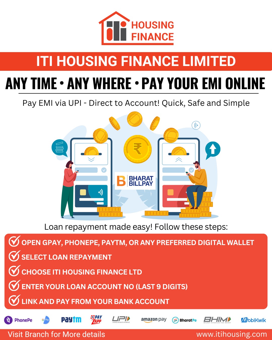 ITI Housing Finance online payment option is one such facility that has made it easy and hassle-free for its current and prospective customers to repay loans. ITI Housing Finance online EMI payment can be made through all major mobile wallets and also via our website after logging in.